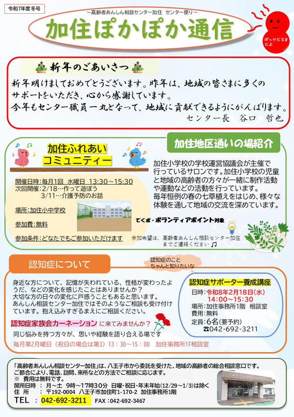 2026/01/15 加住ぽかぽか通信 冬号を発行いたしました 定期発行している「加住ぽかぽか通信」冬号を発行いたしました。本年も住民の皆さまが安心して過ごすことができるよう尽力してまいります。よろしくお願いいたします。 1