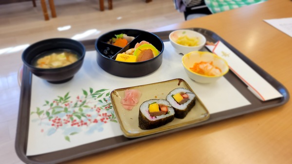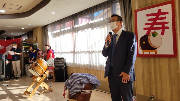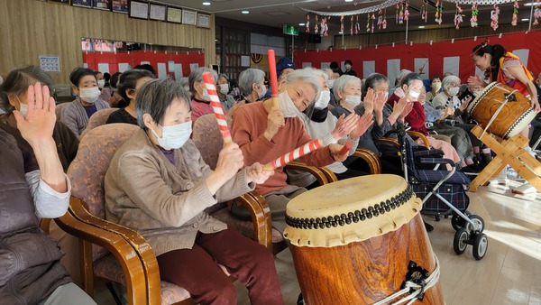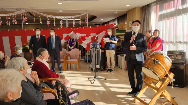 新年祝賀会は、元旦を利用者様・出勤している職員全員でお祝いをする行事となっております。この日は例年1階食堂が「本家の大広間」のように賑やか且つ大騒ぎになるのです。新年のご挨拶もそこそこに、「寿太鼓」様による太鼓の演舞です!(毎年元日からお越しいただきありがとうございます。)その後に、乾杯をしお楽しみのおせち料理とお雑煮が振る舞われます。食後は、職員による獅子舞で利用者様の無病息災を願い、全員にご挨拶に回ります。今年はそれに出張神社と神主が加わり、おみくじを引いて1年間の運勢を占っていただきました。元日から大騒ぎの1年が始まるのです。