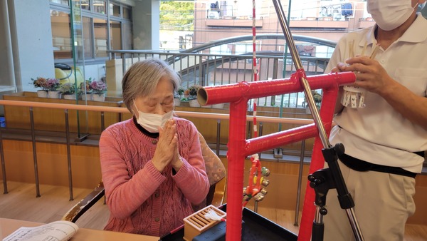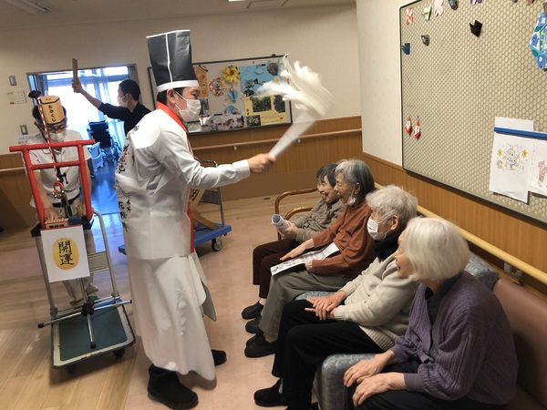 今年より、ファミーマイホームの新年をお祝いするための出張神社と神主さんが登場しました。獅子舞とおみくじ、午年に因んだ馬の絵馬の作品など、利用者様にも参画できる季節行事を、今年もいろいろ企画していきます。(職員の自己満足に終わらないよう気をつけてまいります)