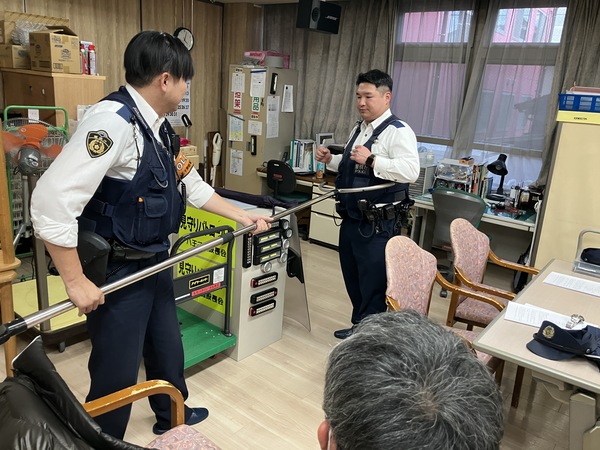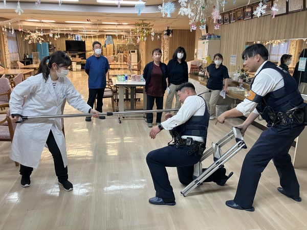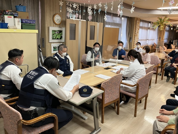 この度、地域の駐在所の巡査長3名にお越しいただき、不審者が侵入したことを想定した対応訓練を実施いたしました。現在の施設における防犯設備や対応マニュアルを想定した実演訓練をし、巡査長の方々にチェックをしていただきました。また、実際にファミーマイホームに整備してある防犯盾やさすまたを使用し、不審者への対応方法を学習しました。今回、ご指摘を受けた点を改善し、順次防犯対策を強化してまいります。