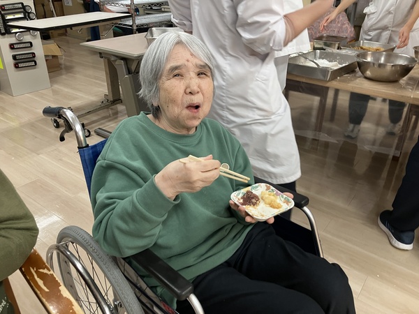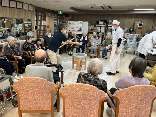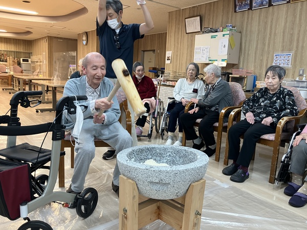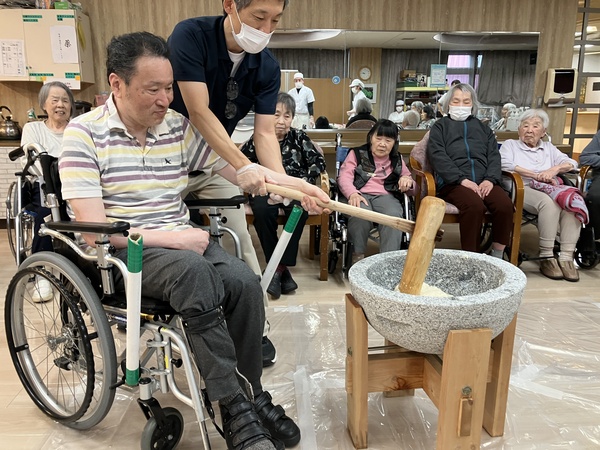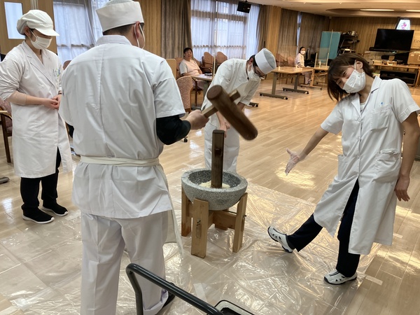 毎年恒例の餅つき、今年もやらせていただきました。ファミリーマイホームのお正月には、お餅が入ったお雑煮を用意させていただいております。そうは言っても、お餅は喉を詰まらせる危険性が高いことは十分理解しております。しかし、利用者様はお餅が大好きなのです!そこで、ファミリーマイホームの栄養課の皆さんが、研究を重ねた結果編み出したのが、「のどごしのよいお餅」です。お餅の純白さともち米の風味を残しつつ、しっかりと歯で噛みきれ、のどごしの良さを兼ね揃えた「まさに高齢者向けのお餅」なのです。そのお餅のレシピの詳細を紹介することはできませんが、そのポイントとなるのは長芋です。長芋をとろろ状にして蒸したもち米に入れ一緒に搗くことで、絶妙なのどごしが生まれます。以前は蒸したじゃがいもを混ぜ合わせておりましたが、できあがったお餅の色が若干黄ばんでしまい、また芋の風味が混ざってしまうという結果になってしまいました。そこから改良を重ねてたどり着いたファミリーマイホームのお餅を、元旦にも利用者様と一緒に安全に食したいと思います。元旦の昼食時のお雑煮を楽しみにしていてくださいね!