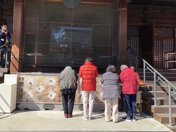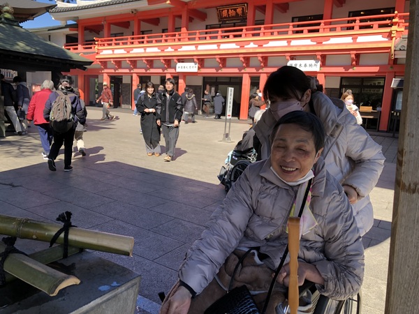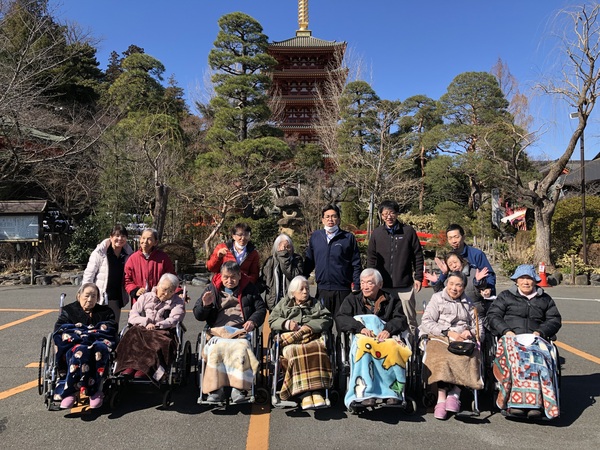 1月に予定していた近隣神社への初詣が、新型コロナウイルス感染症の施設内での感染拡大を受け、2月に順延となりました。今回は、ファミーマイホームから車で30分程度の距離にあります高幡不動尊まで初詣をしてきました。コートなどを着込んでのお参りです。ファミリーマイホームの代表として、有志の利用者様と職員に、皆様の無病息災・交通安全・家庭円満をお祈りしてきていただきました。