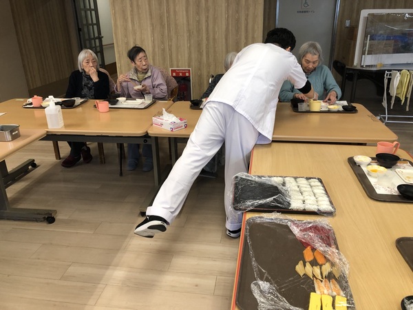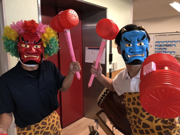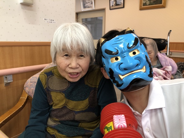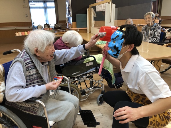 ファミリーマイホームでは、季節の行事を大切にしております。今回ご紹介するのは節分です。鬼に扮した職員に向かい、「鬼は外 福は内」と豆を投げて、昼食には恵方巻きを食べ、無病息災を祈念しているのです。今は、空前の鬼退治ブームです。今年の鬼は獅子舞を従えており、ファミリーマイホームの節分は大賑わい。大ヒットアニメのように懸命に鬼を退治してくださる方がいれば、鬼とでも仲良くなってしまう方もおり、利用者様一人ひとりの人生模様が垣間見れる一幕でした!